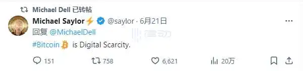 BlockBeats news, on June 23, Michael Dell, the founder of Dell, a world-renowned IT brand, recently posted "Scarcity creates value" on his social platform, and Michael Saylor replied to his tweet that "Bitcoin represents digital scarcity." Michael Dell then retweeted Michael Saylor's reply tweet.
