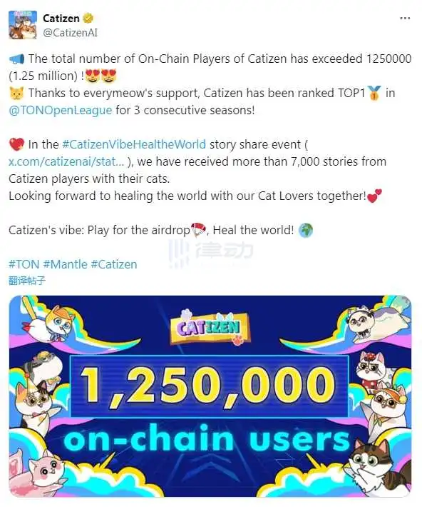 BlockBeats news, on June 23, Ton Ecological Chain Game Project Catizen posted on social media that the total number of players on its chain has exceeded 1.25 million. Meanwhile, Catizen has been ranked first in The Open League for three consecutive seasons.