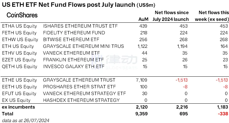 BlockBeats news, on July 29, CoinShares research director James Butterfill posted on X that the newly launched Ethereum ETF attracted $1.183 billion in inflows in the first week. However, due to the large-scale outflow of funds from existing Grayscale funds, the overall net outflow was $338 million.