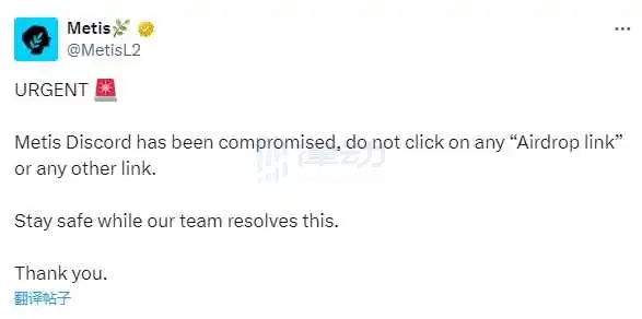 BlockBeats news, on July 30, Ethereum Layer2 network Metis issued a warning on the X platform that Metis' Discord has been hacked, please do not click on any "airdrop link" or any other link.