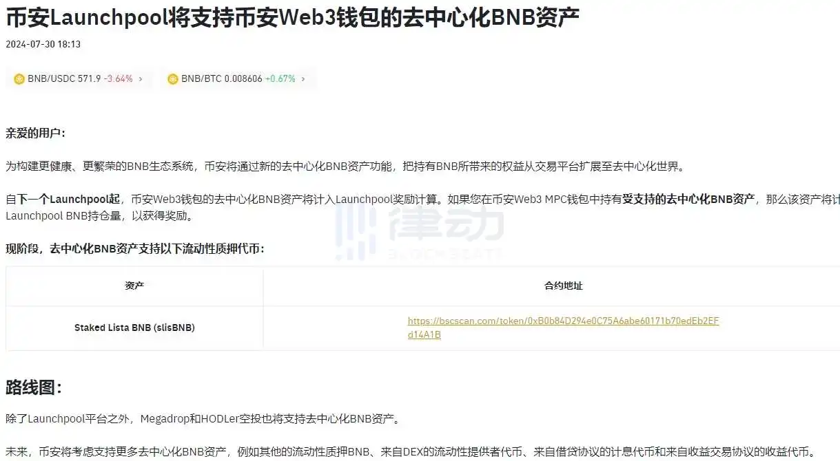 BlockBeats news, July 30, according to the official announcement, starting from the next Launchpool, the decentralized BNB assets of BinanceWeb3 wallet will be included in the Launchpool reward calculation. If the user holds a supported decentralized BNB asset in the BinanceWeb3 MPC wallet, then the asset will be counted in the Launchpool BNB holdings to receive rewards.