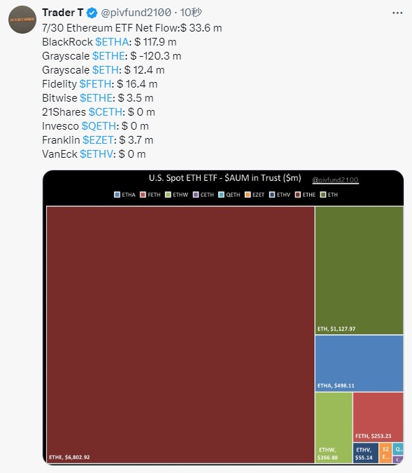 BlockBeats news, on July 31, according to Trader T data, yesterday Ethereum ETF had a net inflow of $33.6 million.