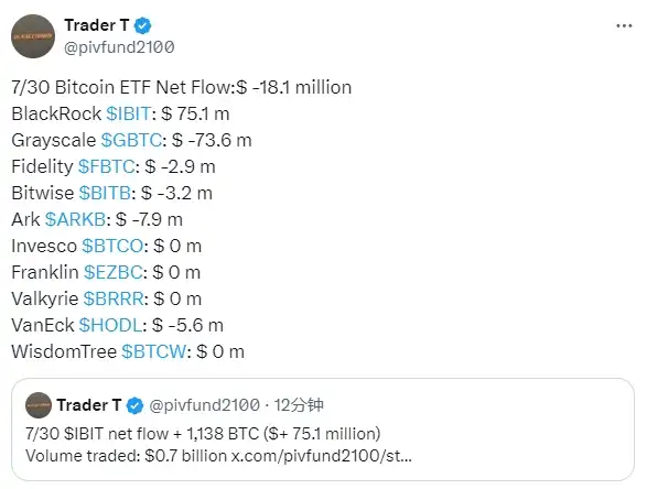 BlockBeats news, July 31, according to Trader T data, Bitcoin ETF net outflow of $18.1 million yesterday.