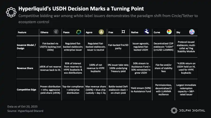 During the USDH bidding process, nearly all major white-label stablecoin issuers participated, including Native Markets, Paxos, Frax, Agora, MakerDAO (Sky), Curve Finance, and Ethena Labs. This marked the first large-scale competition at the application layer of the stablecoin economy, signaling a redefinition of the value of "distribution rights."