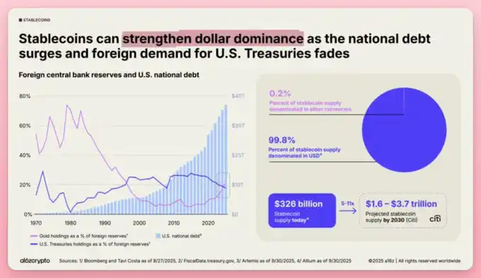 According to an a16z report, stablecoins can further strengthen the global dominance of the U.S. dollar amidst a surge in U.S. national debt and weakening foreign demand for U.S. bonds.