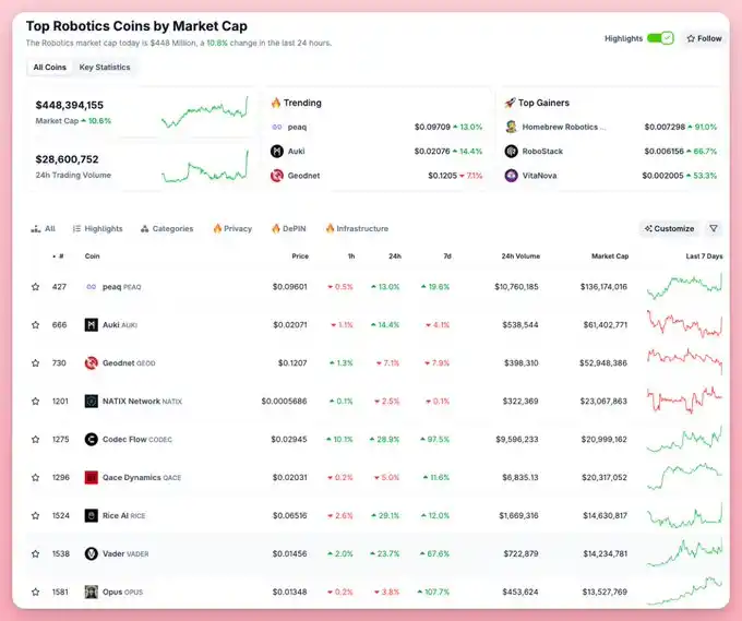 Peaq: Provides machine IDs and a payment system for autonomous robots. In a "robot farm" in Hong Kong, robots are responsible for planting and selling crops, with the income paid to the NFT-based farm owners. This is a typical case of robot cash flow → token returns.