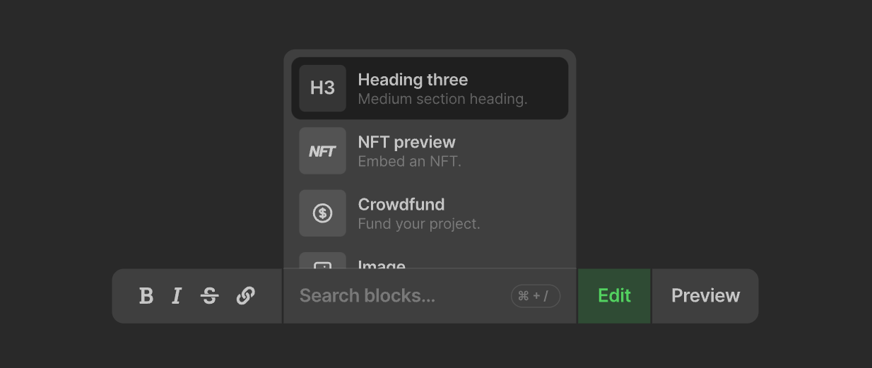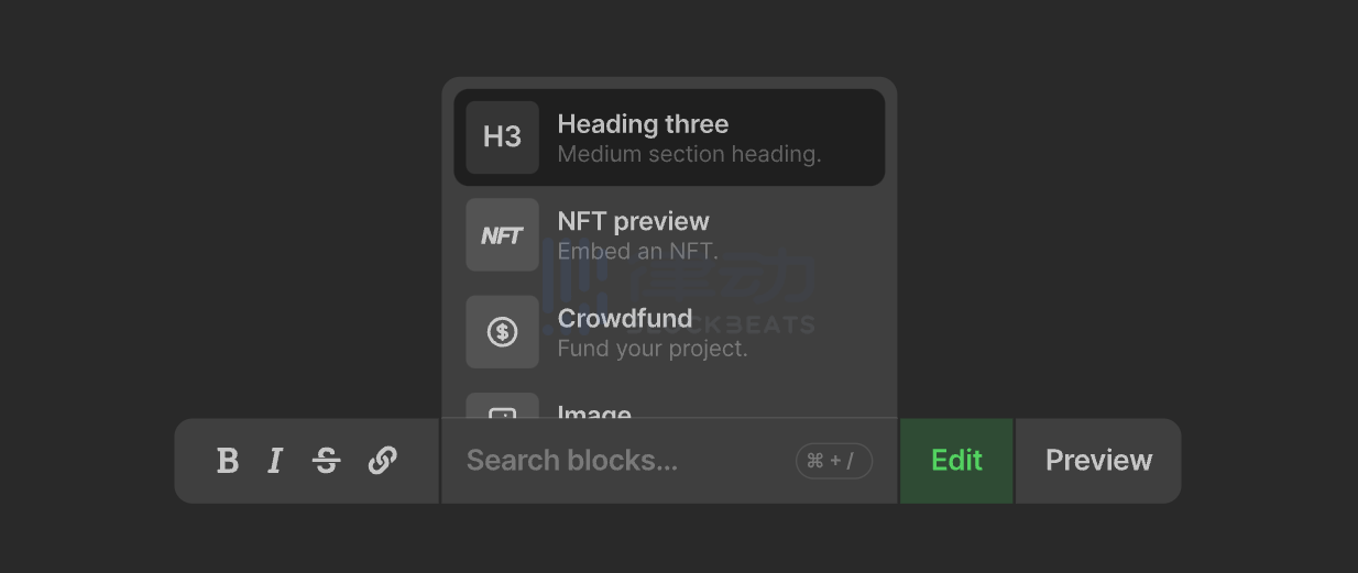Mirror 是一个新的项目,我们的编辑器有意集中于此快速改进,因为我们想要快速行动,创造新的经济工具来资助伟大的写作。随着时间的推移,我们计划推出一个新的编辑器,实现就地编辑,消除在编辑和预览模式之间切换的需要。在那之前,我们感谢您的耐心,并欢迎任何反馈。