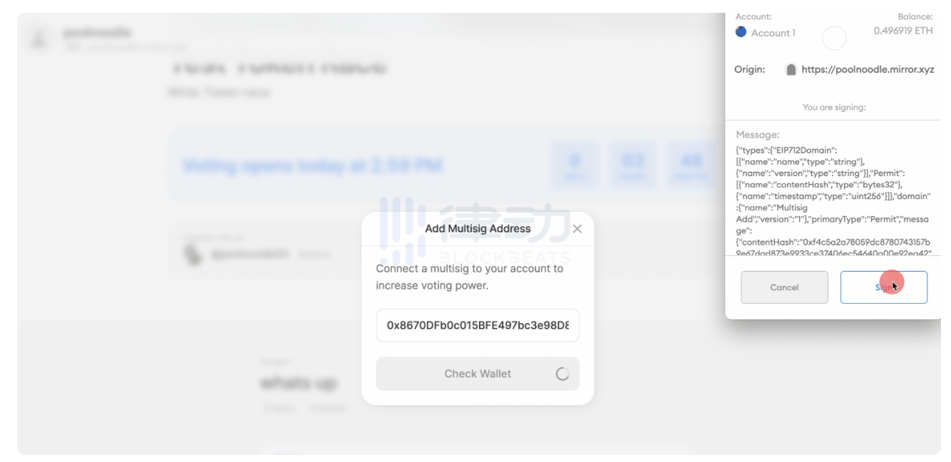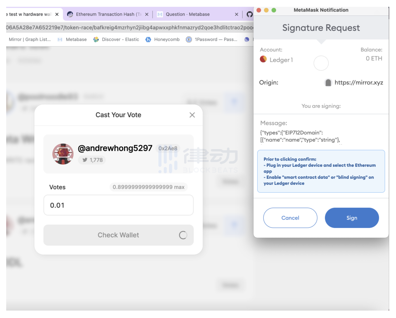 8、一旦你分配了票数并投了票,Metamask 就会提示你从你的硬件钱包中签署该信息。