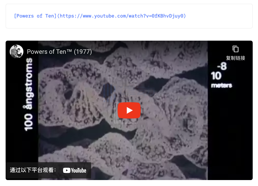 在 Mirror 上插入媒体与经济模块是通过一个简单的格式规则来识别的:在它自己的文本行中有一个单独的链接。如果要手动创建一个模块,需要插入一个新的文本行,添加一个链接,然后换行。确保新插入的文本行只包含一个单独的链接。下面是讲一个 YouTube 视频插入文章的示例。