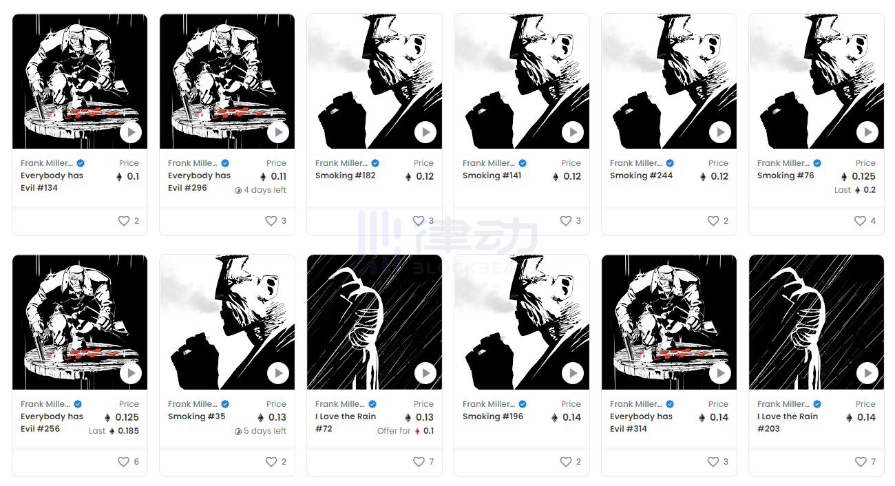 其次,影视或动漫在制作结束后,往往会有大量的素材弃用剩余,一些功能性的媒体资产例如:故事板、3D 模型、场景道具等等,这些资产大部分情况只会储存下来,以备续集的制作作为参考,并没有直接的经济价值。但是 NFT 的出现,给这些有价值的资产找到了新的输出渠道。例如,在电影《罪恶之城》上映 30 周年的纪念日,导演 Frank Miller 将电影原本的故事板进行加工,并登陆 OpenSea 销售;王家卫的《花样年华-一刹那》NFT 作为 1999 年影片开机当天的拍摄片段,在苏富比秋季拍卖会以 428 万港元成交等等。媒体资产的再利用,成为了目前电影公司发售 NFT 的主要原因。