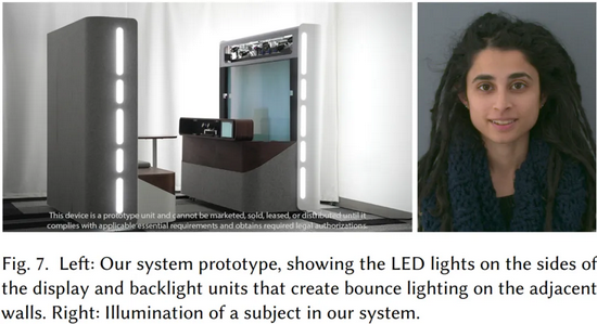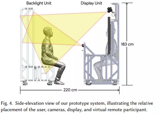 如下图 4 所示,谷歌的系统主要有两个组件:一个包含显示器、摄像头、扬声器、麦克风、照明器和计算机的显示单元,另一个是包含红外背光并用作 bench seat 的背光单元。两个单元都包含向墙壁和天花板倾斜的白色 LED 灯条,用于产生柔和的反射照明。