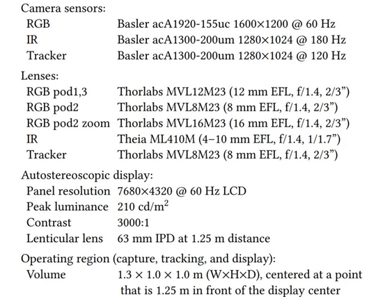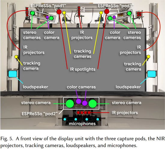 捕获子系统由三个同步立体的 RGBD 捕获 pod 组成:两个在显示器上方,一个在显示器下方的『中墙』(middle wall)中。更下方的 pod 包括一个额外的彩色相机,用于放大拍摄对象的脸部。另外,四个单色追踪摄像头中的两个在显示器上方,其余两个一侧一个,用于捕捉眼睛、耳朵和嘴巴的高速广角图像。