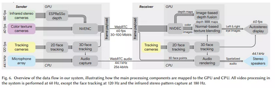 下图 6 为系统中的数据流,展示了 Starline 主要的处理组件如何映射到 GPU 和 CPU。系统中的所有视频处理都在 60 Hz 下进行,除了 120 Hz 的面部跟踪和 180 Hz 的红外立体模式捕获。