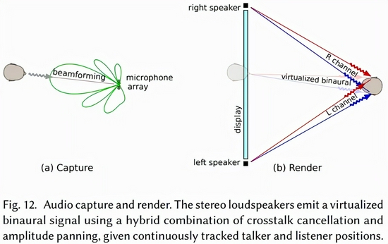 该研究使用的音频传输技术是将一系列先进技术进行组合:talker-tracked 波束成形、混响消减、WebRTC 传输、talker/listener-tracked 虚拟音频合成、双耳串扰消除分频组合以及振幅平移。与传统的视频会议系统相比,对谈话者和倾听者精确的追踪是共享空间达到真实性的关键因素(图 12)。据了解,这是首次在视频会议中无需耳机、头部追踪的音频技术。