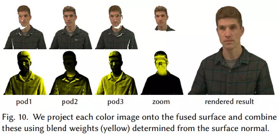 对于左视图和右视图,该研究通过将彩色图像投射到融合几何体上来获得每个像素的颜色(图 10):