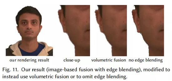 图 11 显示了没有边缘融合的不规则像素化轮廓。该图还显示,基于图像的融合提供了比轮廓附近体积融合(volumetric fusion)更完整的重建:
