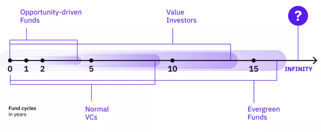 从技术上讲,我们可以根据基金周期绘制一系列风险投资——从投机、机会驱动的基金到「常青」基金。从谱图上看,无限基金则是将其基金周期扩展到无限的基金。