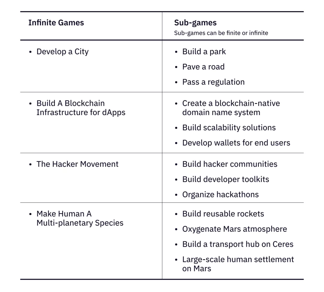 从创始人角度出发,这里有很多无限游戏的例子。想象以下的无限游戏,我们稍后会再次回来研究:发展一个城市、为去中心化系统构建区块链基础设施、使人类成为多行星物种、极客运动。