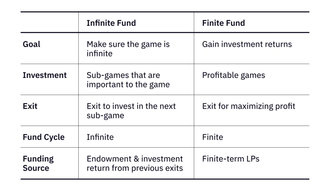 无限基金具有无限基金周期,通过投资其子游戏来投资无限游戏。子游戏可以是有限游戏,但无限游戏才是最终目的。为了评估,比较无限基金和有限基金之间的差异,我们可以从这五个指标进行考量:目标、投资动机、退出策略、基金周期和资金来源。