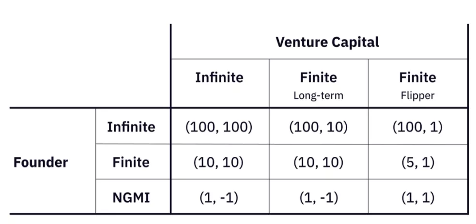 在这个游戏中,我们考虑了一种新的行为——无限性。无限游戏可以解释为不是为了获胜而进行游戏,而是为了继续游戏(Carse)。对于创始人来说,无限游戏是显而易见的。对于风险基金来说,无限意味着支持创始人确保游戏的无限性。