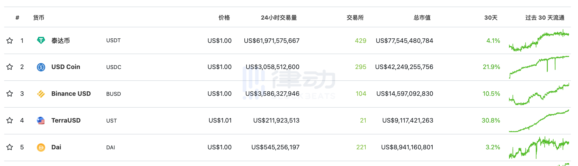 此外,据 Coingecko 数据,随着市值突破 90 亿美元,Terra 生态的稳定币 UST 也超过了 DAI 的市值,在稳定币市值排名中上升至第四。目前,市值排在前三的稳定币则分别是 USDT(775 亿美元)、USDC(422 亿美元) 和 BUSD(146 亿美元),同时这三个都是中心化稳定币。因此,作为去中心化稳定币的 UST,已然成为了该赛道的龙头项目。
