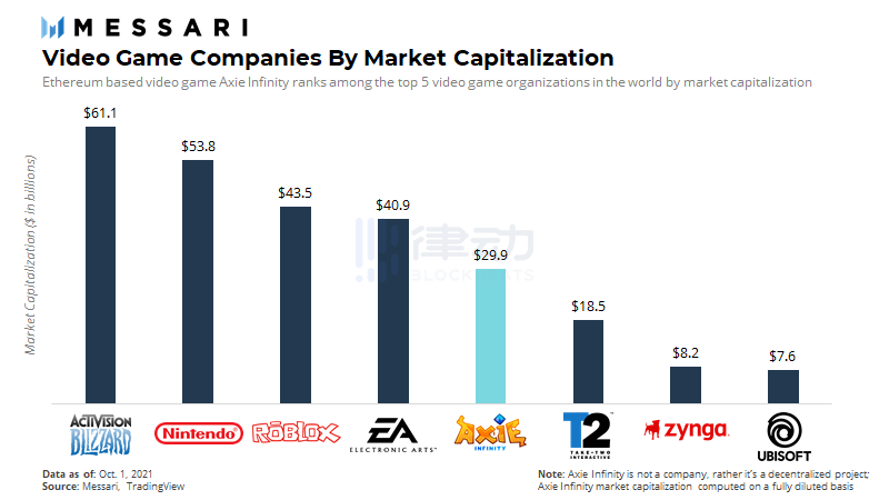 而在 GameFi 领域,诸如 Axie Infinity 等项目已展示出了区块链驱动去中心化游戏的惊人潜力。据 Messari 数据,目前 Axie Infinity 的市值与传统视频游戏公司已不相上下,在今年 10 月就紧随艺电公司之后,排到了全球视频游戏公司市值的第五位,同时接近育碧市值的 4 倍。