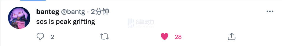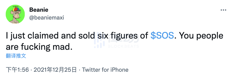 不过也有 KOL 表达了相反的观点,PUNKS Comic 创始人 Beanie 就在个人社交媒体中表示人们对 SOS 的追捧是不可理喻的,不过他也仍旧领走了空投并将 SOS 卖出,笑纳了这份法币计价 6 位数的大礼。