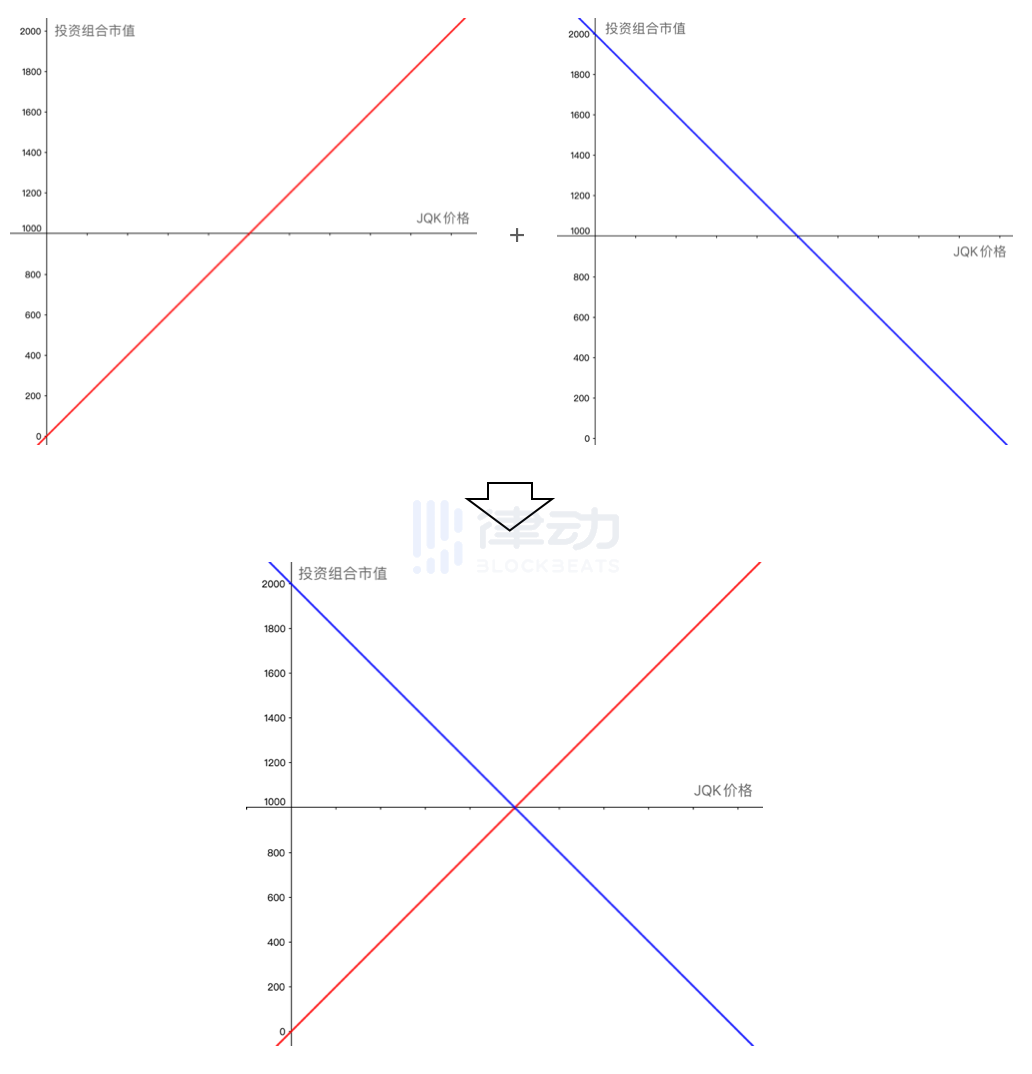由于你只是想享受高达 500% 的挖矿收益,既不了解也不想承担持有 JQK 的风险,因此你希望能够将这部分风险转移,使得 JQK 的涨跌与你不再相关。也就是说,你希望你的投资组合市值曲线变为一条水平直线。