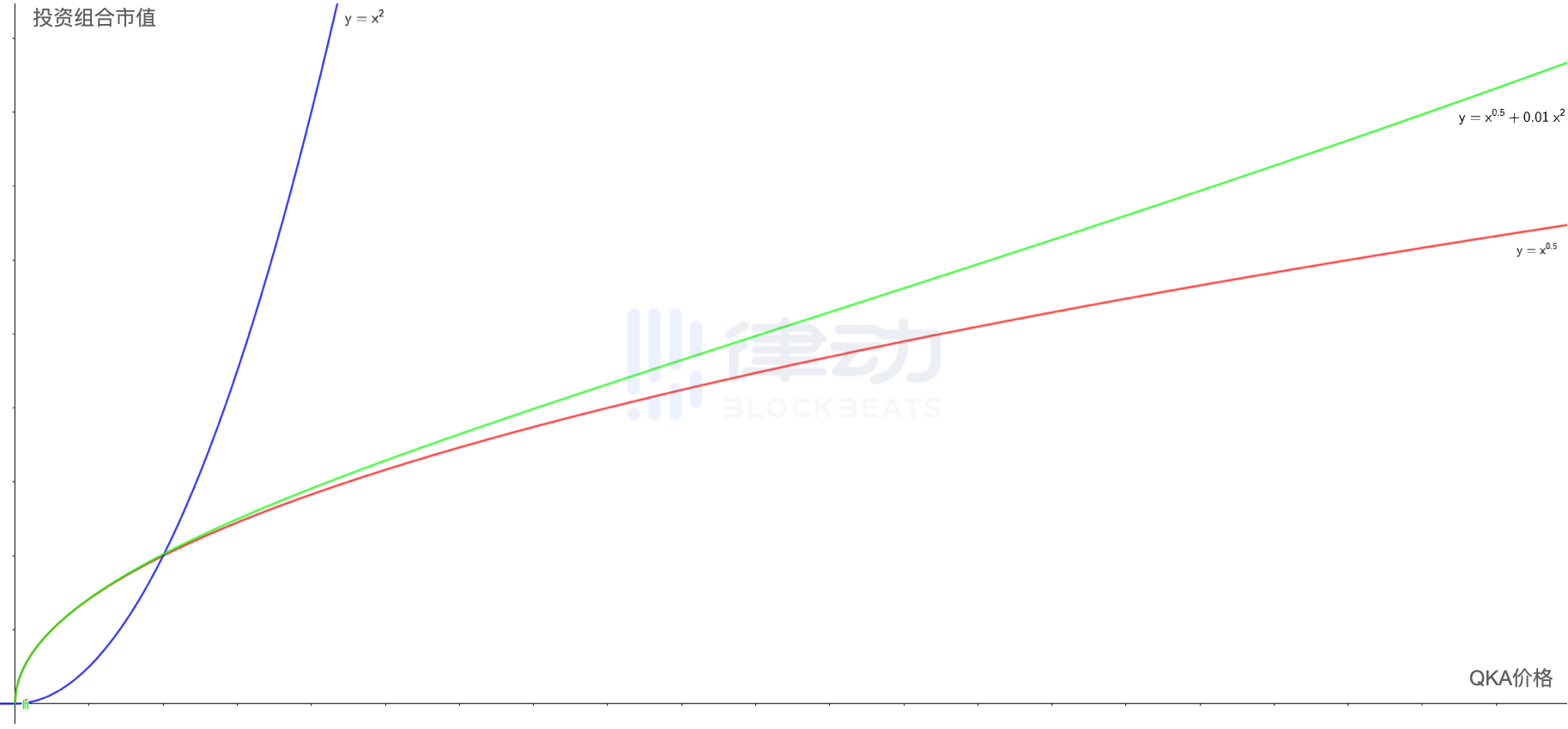 经过尝试,我们将两条曲线按照 1:100 的比例混合,最终拟合的结果便是下图中绿色的曲线。可以看出,除了在极端值(QKA 价格极小或极大)以外,绿色曲线已经很接近一条直线了。