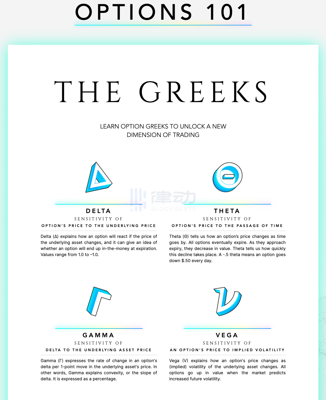 正文中为了更直观地解释套期保值的基本原理,我们在案例中使用了过多如倾斜、弯曲等描述性词汇。但是在实际操作中,我们依然需要定量的参考指标,以便我们计算为了转移风险而需要购买的衍生品数量。这种定量的参考指标被习惯性的用希腊字母来表示,以下我们便用白话介绍其中最常见的三个希腊值。(当然以下表述也并不严谨,只为让初学者有个直观的感受)