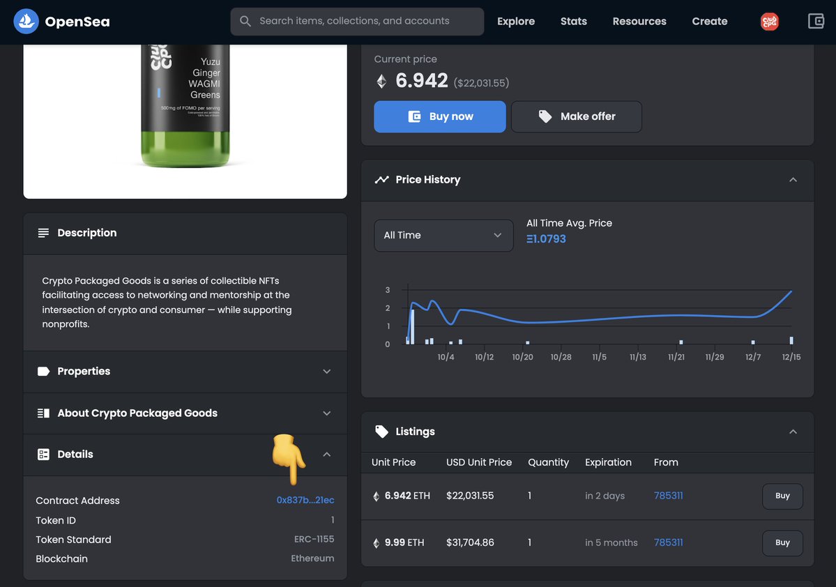 要查找 NFT 合约,首先导航到 OpenSea 上的列表,然后点击「Details」,这里会显示一个「Contract address」链接。