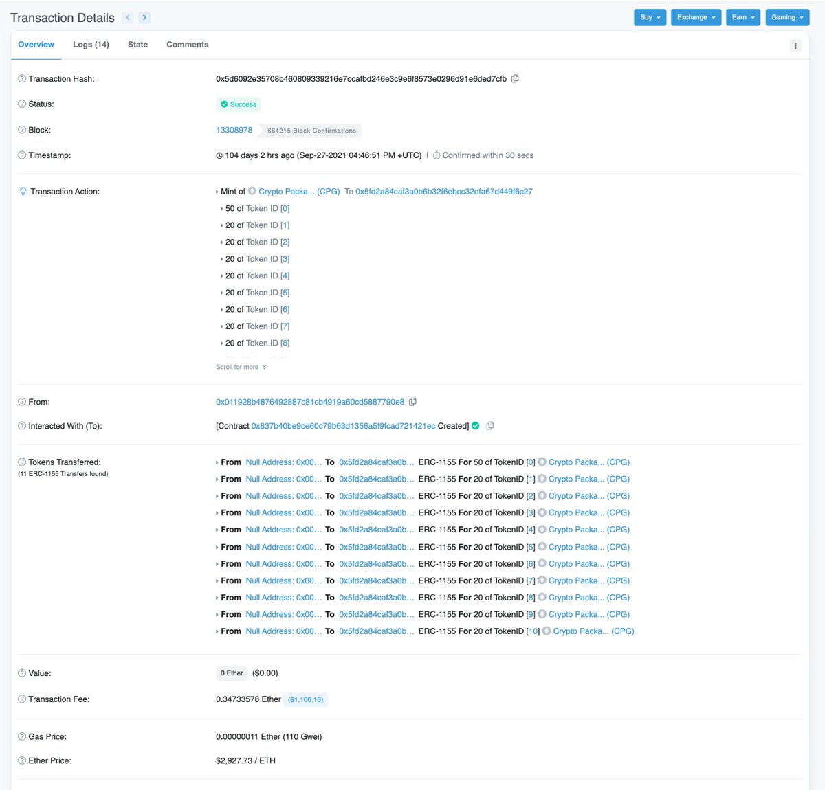 在这里,我们能看到关于创建合约的交易的详细信息。