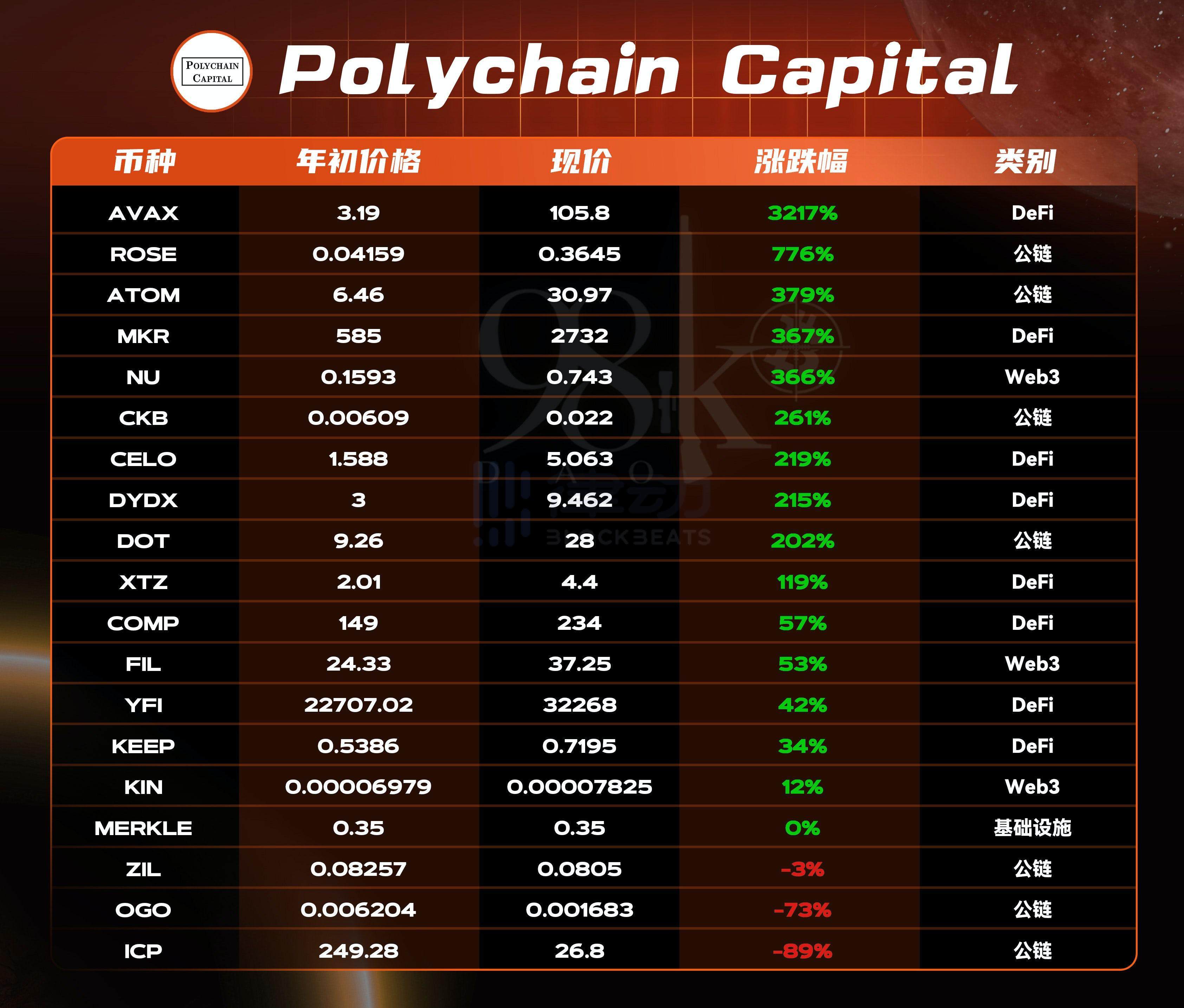 涨幅最大的是 3217% 的 AVAX,跌幅最大的是-89% 的 ICP。
