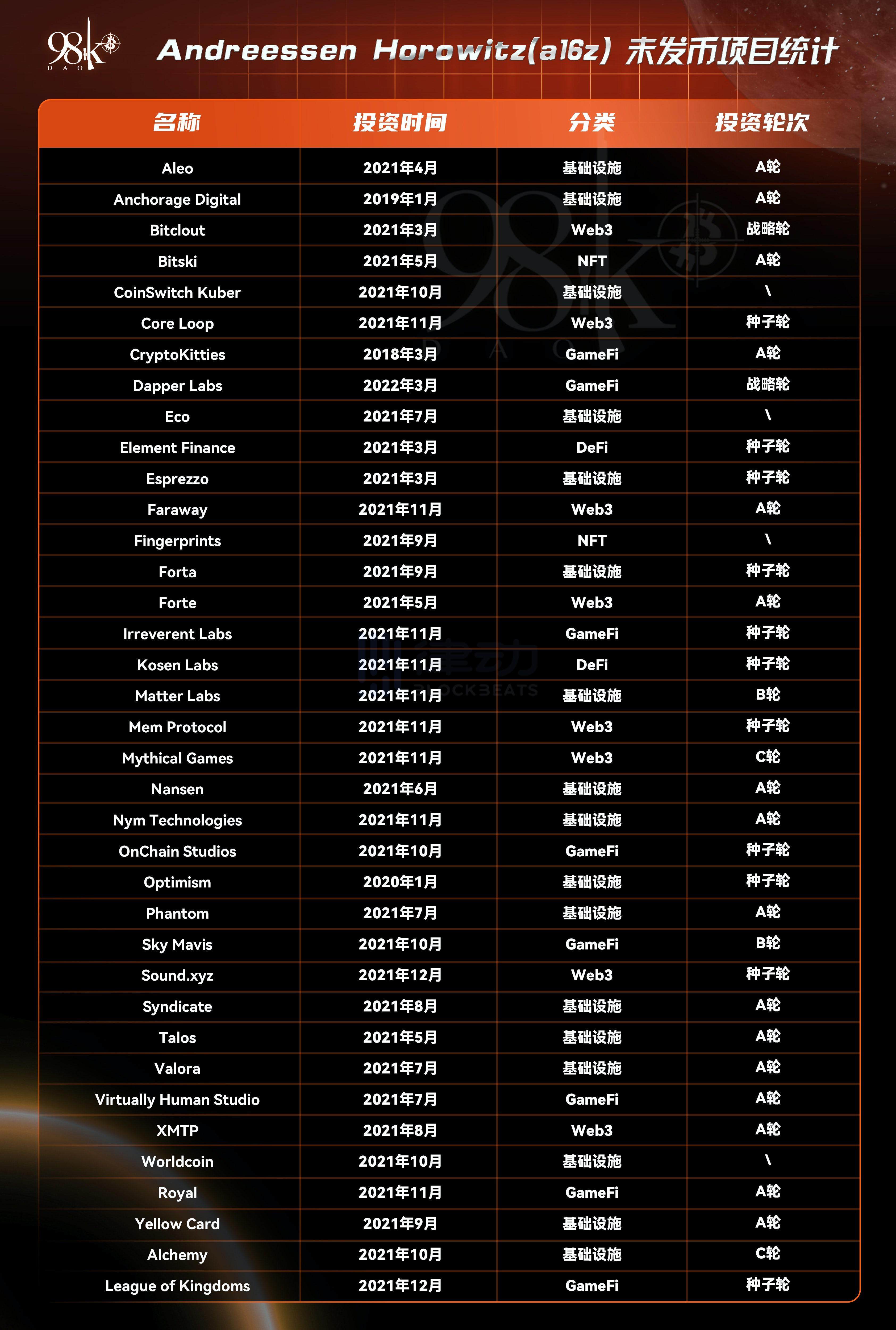 以下统计为 a16z 已投资但未发币项目: