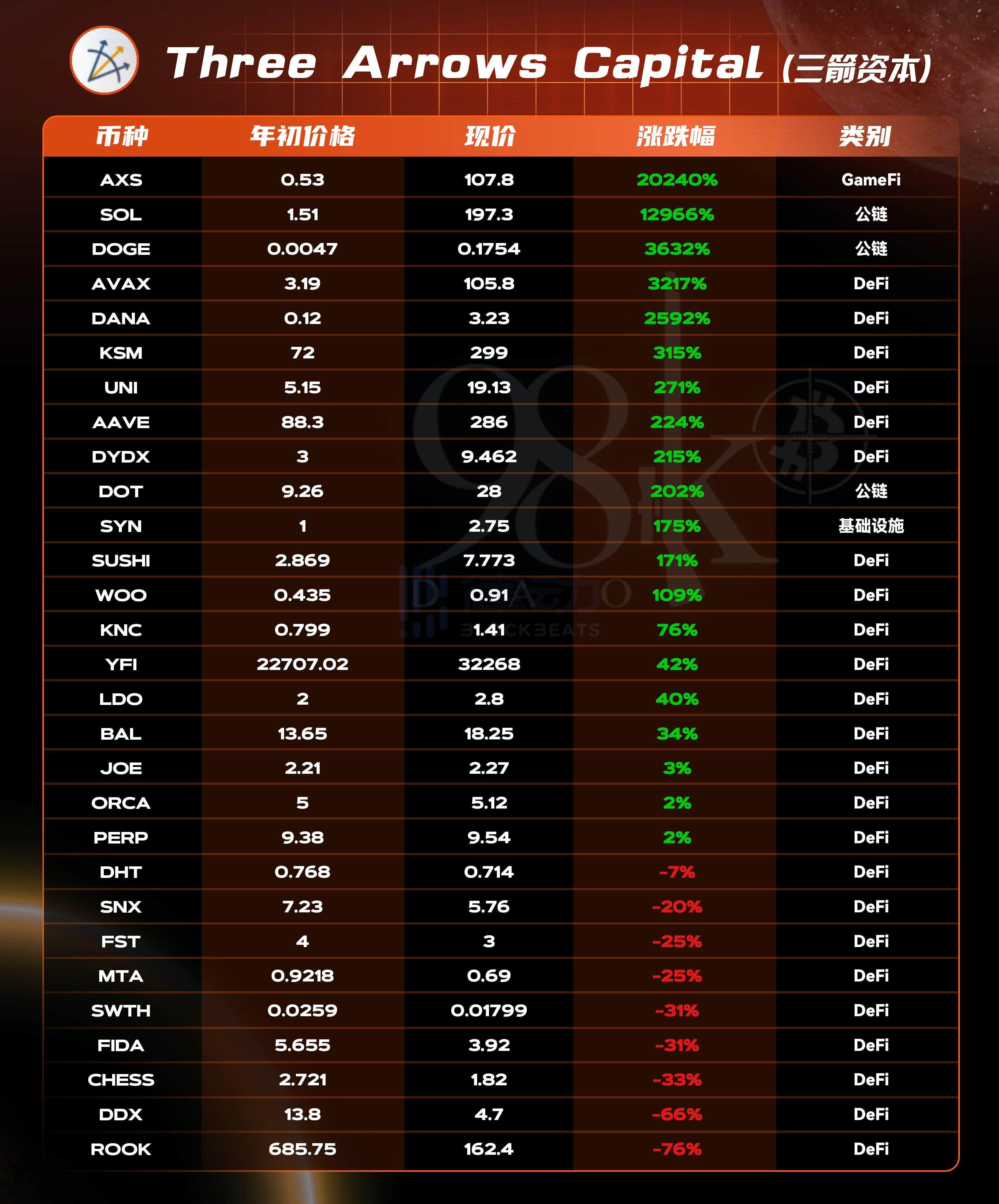 虽然 Three Arrows Capital 整体的表现数据不是特别出色,但在个别项目的表现还是十分亮眼的。涨幅最高的项目是 20240% 的 AXS,跌幅最大的是下跌 76% 的 ROOK。