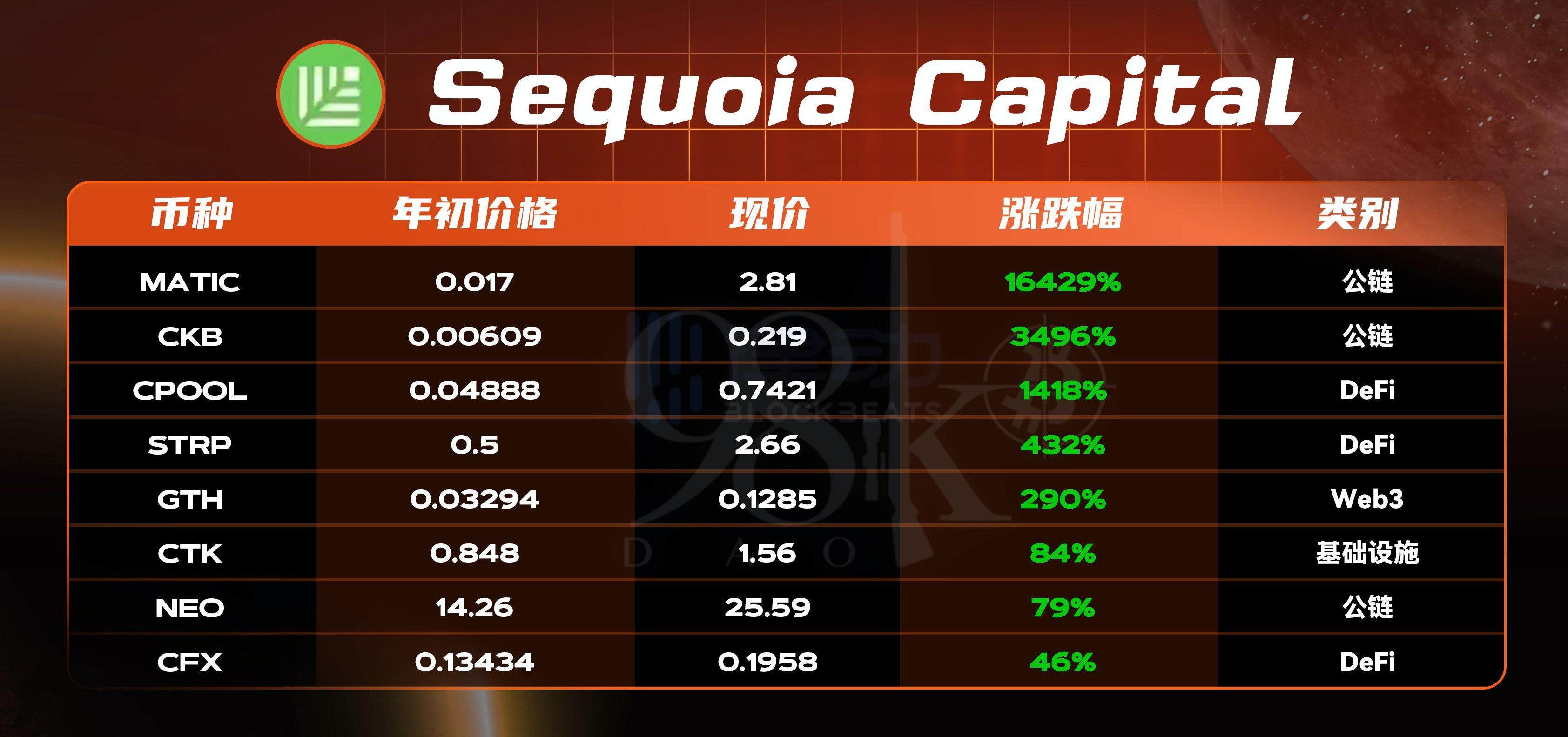 Sequoia Capital 投资组合正涨幅率也是 100%,只有一个百倍币 MATIC(164 倍),10-50 倍占 25%,1-10 倍占 25%,小于 1 倍的占 38%。涨幅最高的是 16429% 的 MATIC,涨幅最低的是 46% 的 CFX。