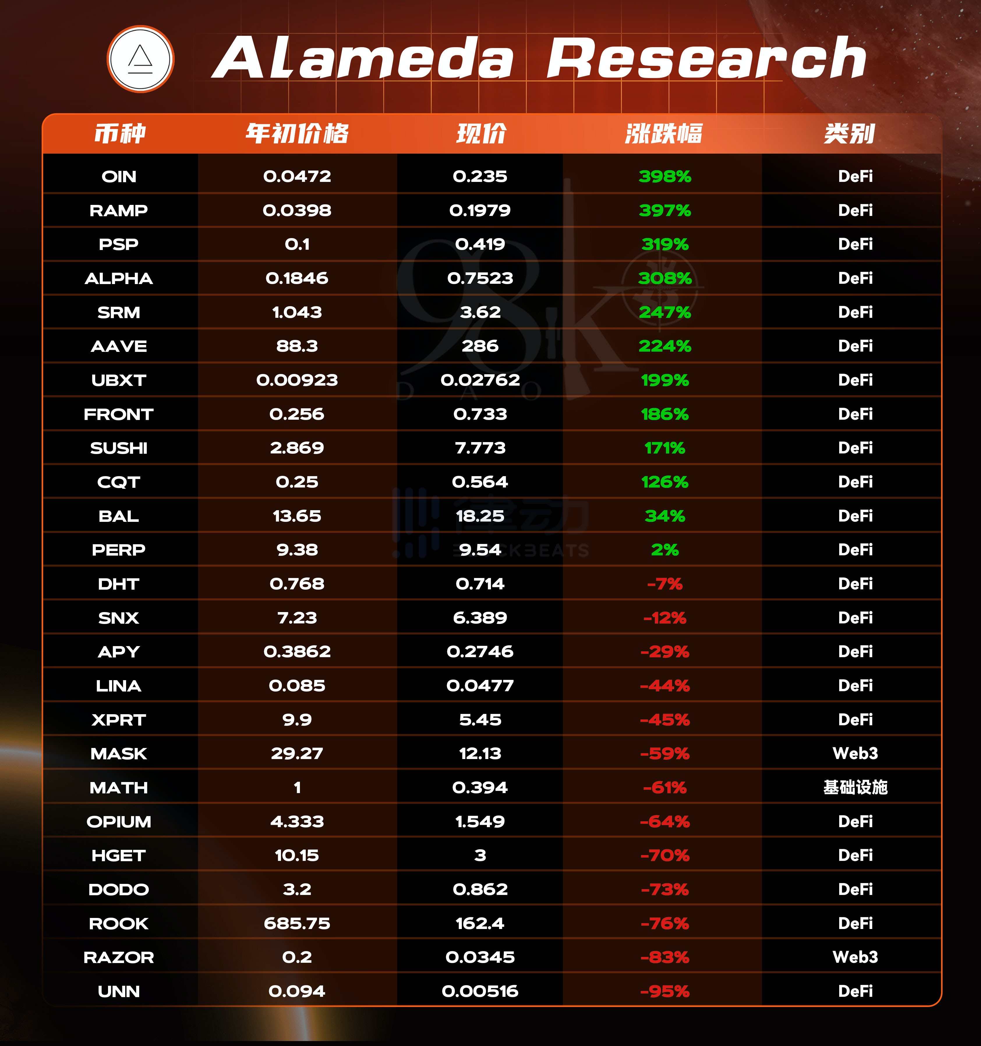 Alameda Research 在所有机构的投资组合中正涨幅率是最低的只有 48%,最大涨幅币种的也是所有机构中最低的只有 398%,投资组合的涨幅集中在 1-3 倍占总数的 40%,小于 1 倍的占 8%。