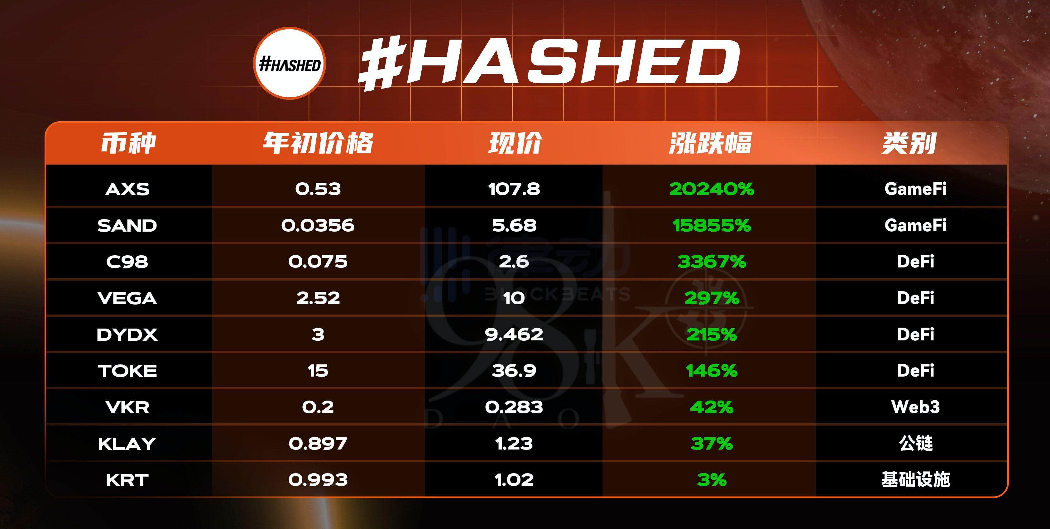 以下数据为 #HASHED 所投资且已发币项目在 2021 年的币价表现: