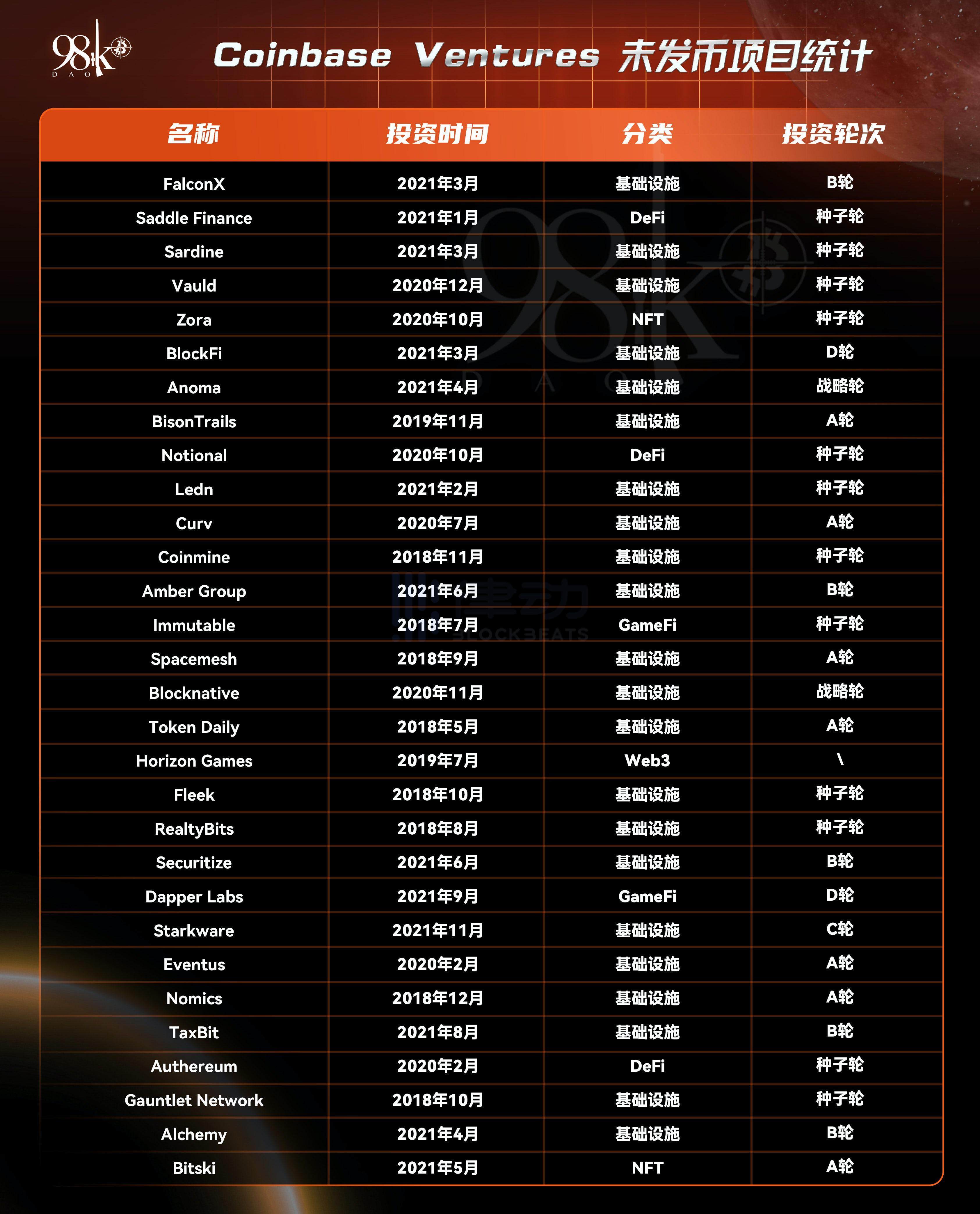 以下统计为 Coinbase Ventures 已投资但未发币项目: