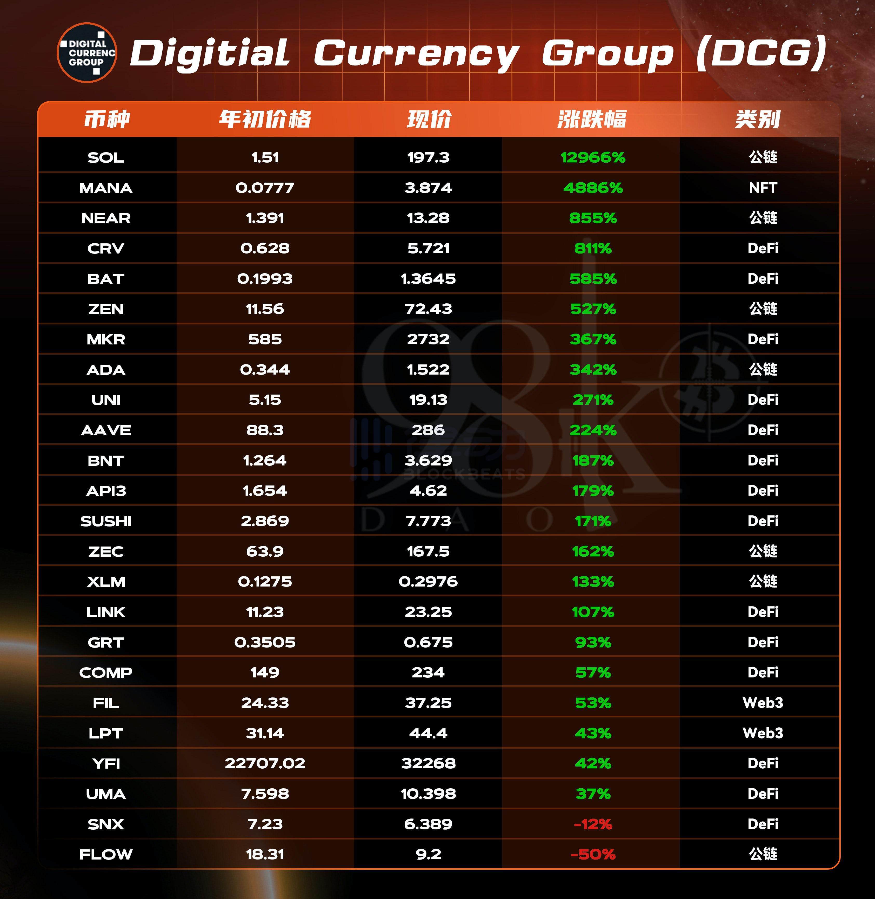 以下数据为 DCG 所投资且已发币项目在 2021 年的币价表现: