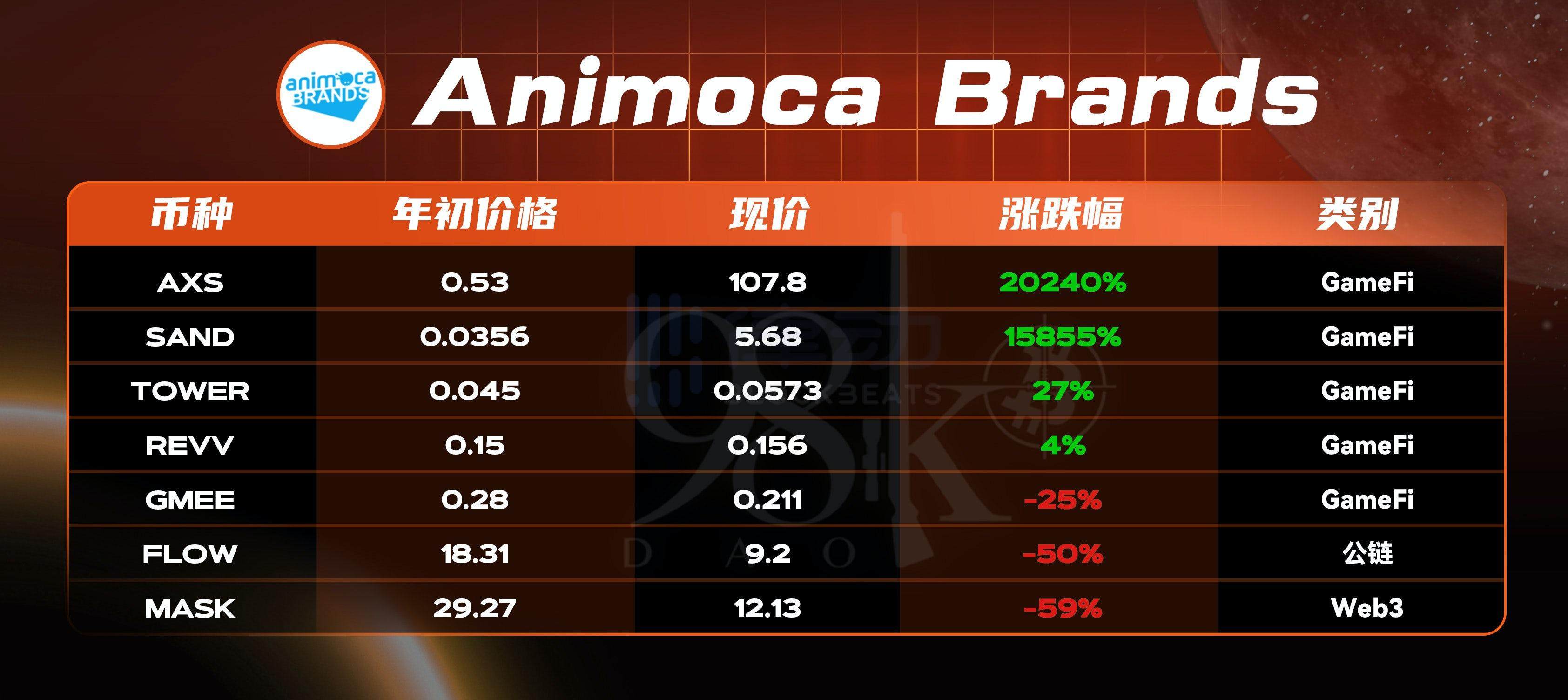 以下数据为 Animoca Brands 所投资且已发币项目在 2021 年的币价表现: