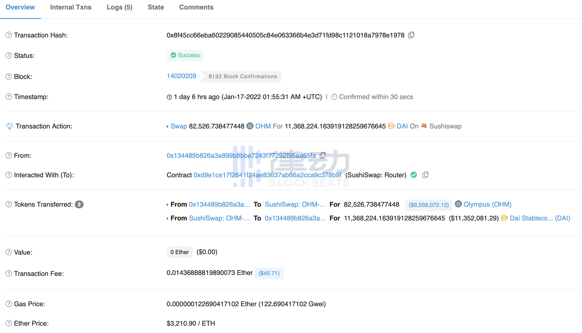 这一次 OHM 暴跌的原因主要还是巨鲸的抛售。下图中的这个地址一次性抛售了 82,526 枚 OHM,价值 1100 万美元,因此产生了相当大的滑点效应。这引起了一些 Token 持有者的恐慌情绪,为 OHM 带来了进一步的抛售压力,使得大量质押在 DeFi 协议里的 sOHM 被清算。
