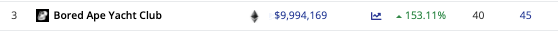Yuga Labs 寻求融资的消息一出,无聊猿 NFT 的二级市场交易量大幅增长,据 CryptoSlam 数据显示,截止发稿时,无聊猿 NFT 24 小时交易额约 1000 万美元,涨幅 153.11%。