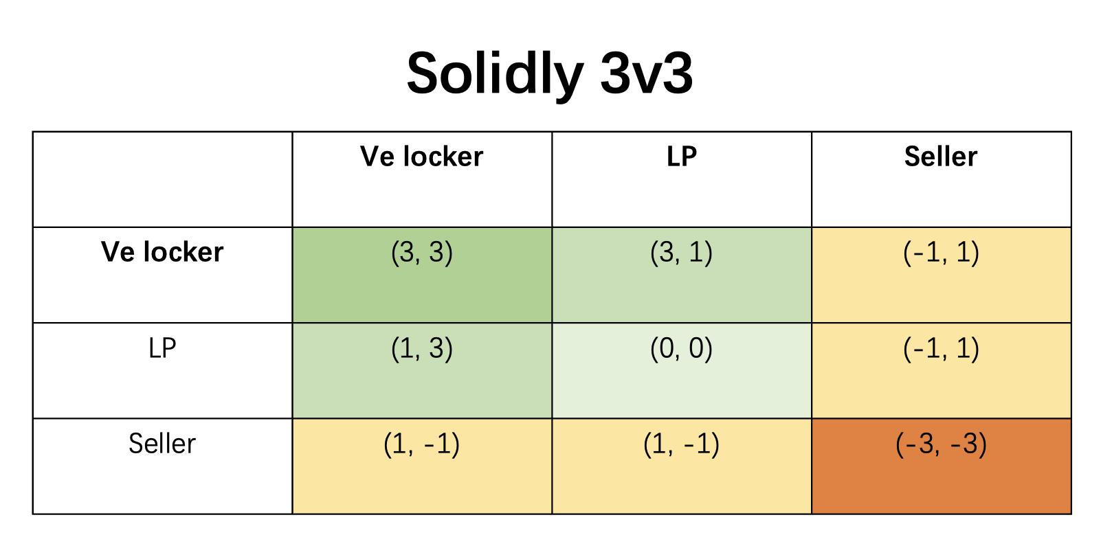 OlympusDAO 的3v3 是在 bonding 和 Staking 两种激励机制下双方在不同选择下的博弈的结果,展示了参与者应如何合作达到最大收益。同样地,Ve(3,3) 的参与者在锁仓 (Ve) 和提供流动性两种激励方式中选择,也呈现了类似的博弈结果。