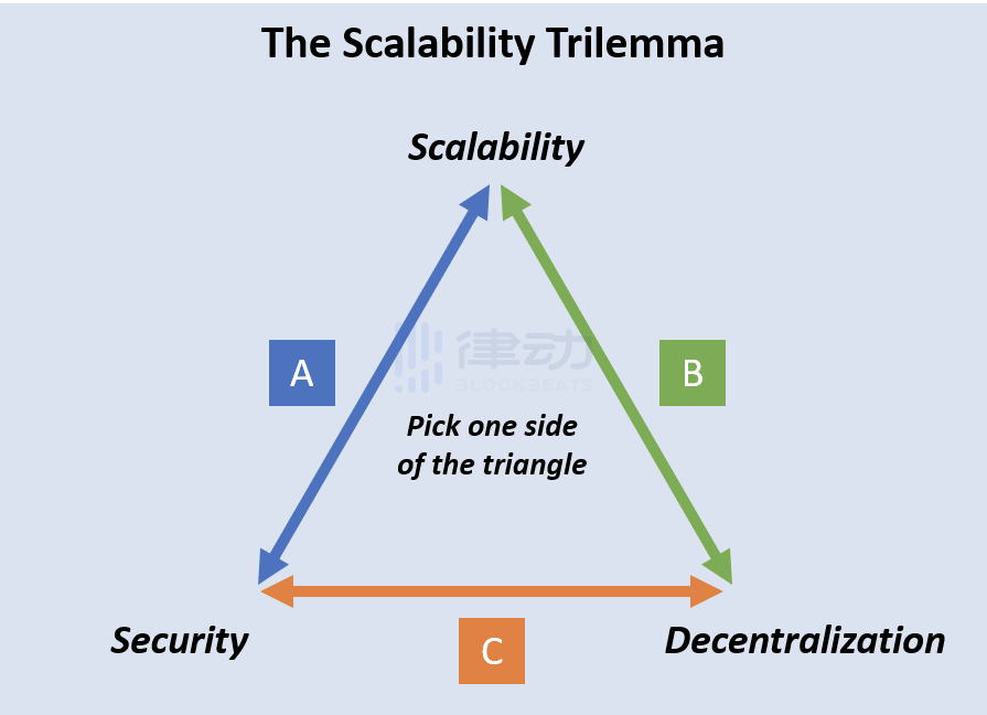 以太坊创始人 Vitalik Buterin 提出的区块链可扩展性三难困境指出,在去中心化、安全性和可扩展性这三个属性之间进行权衡是不可避免的,你可以照顾到一个或两个属性,但不能同时兼顾三个。