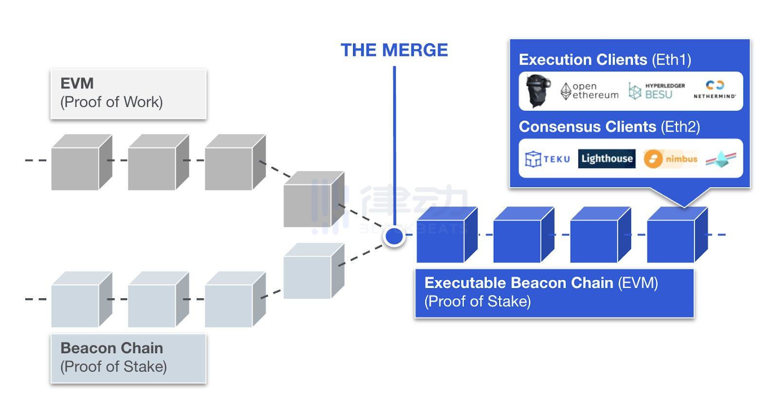 合并是指当运行在 PoW 上的以太坊主网与作为 PoS 链的 Beacon 链集成时将会发生的事。
