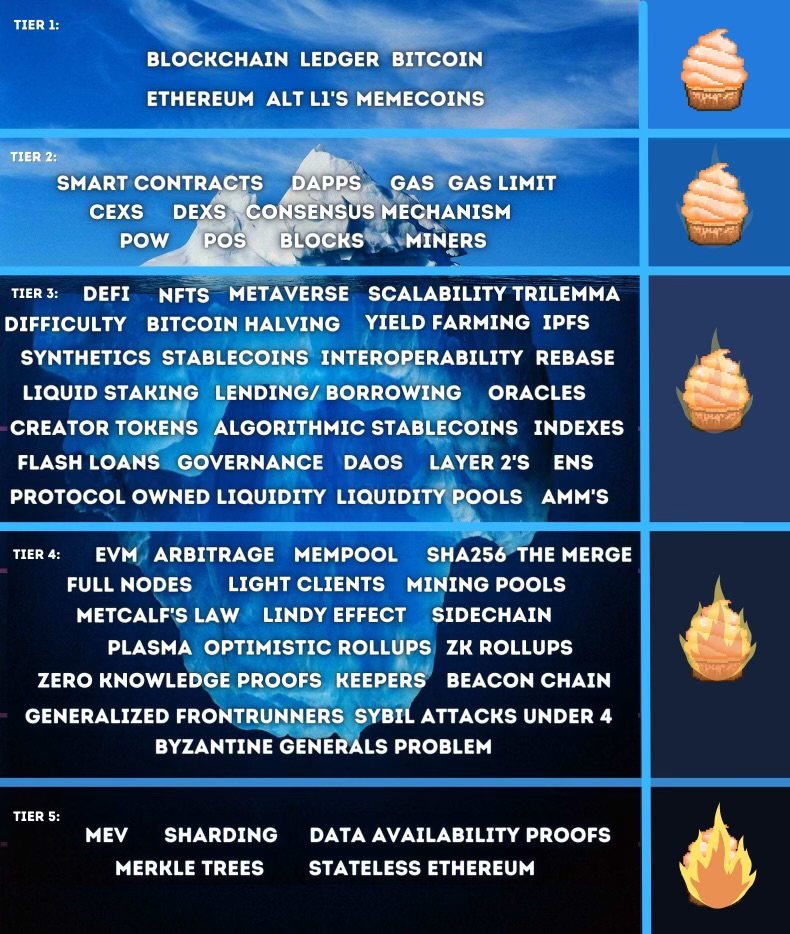 区块链和加密世界由复杂的知识体系构成,我将这一体系分为五个知识阶层,层层深入地揭开加密冰山的面纱。