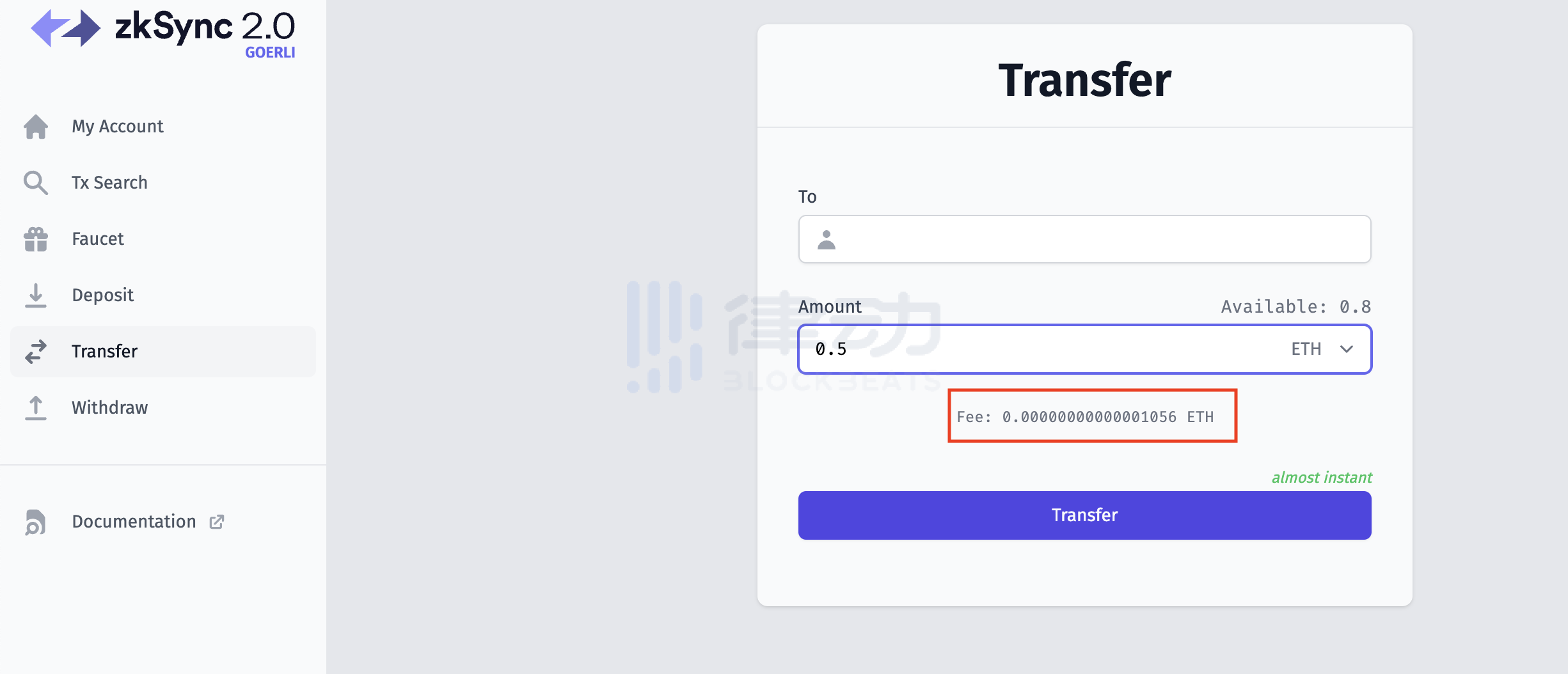 将 ETH 转到 zkSync 后,我们就可以在 Layer 2 转移资产了。页面会提示切换到 zkSync Testnet,新版的 zkSync 支持 ECDSA 签名,因此我们可以直接使用以太坊主网的钱包地址。点击「Transfer」选项,填入目标帐户的以太坊主网地址即可转移资产,手续费基本为零。