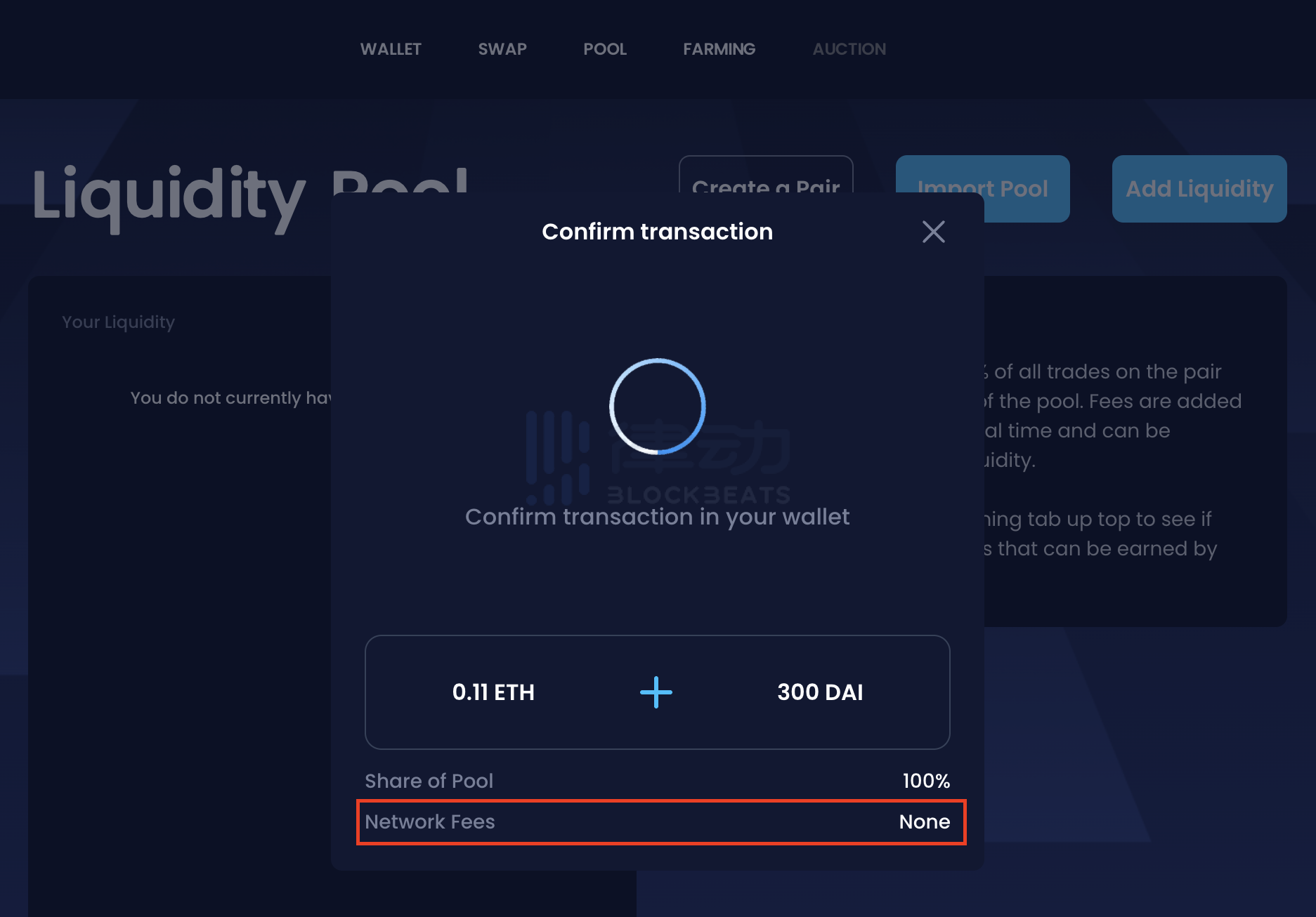 在「Pool」页面我们可以创建或者提供流动性池,而在「Farming」页面则可以质押 LP Token 以赚取收益,同样不需要支付 gas 费。