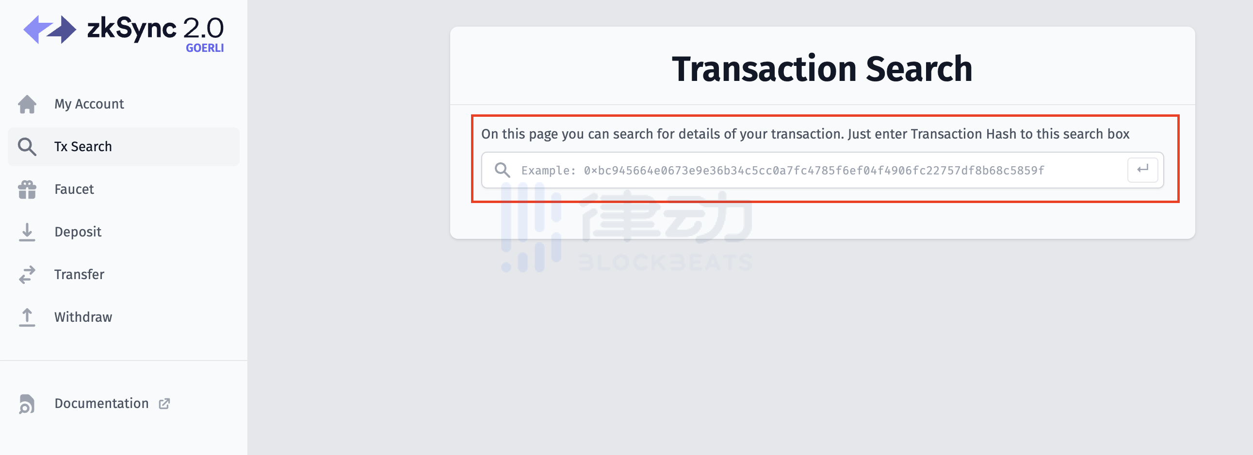 最后我们可以选择「Tx Search」选项,输入交易的哈希值,即可查看自己在 zkSync 测试网上的记录。